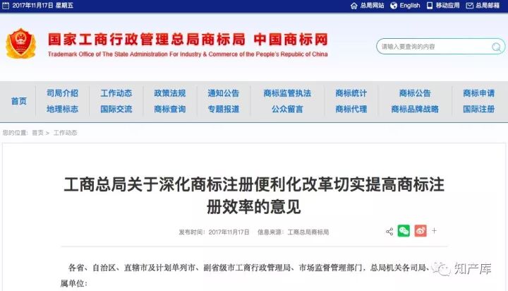 2017.11.17日,商标局发布《工商总局关于深化商标注册便利化改革切实提高商标注册效率的意见》,信息量太大,知产库划重点如下: