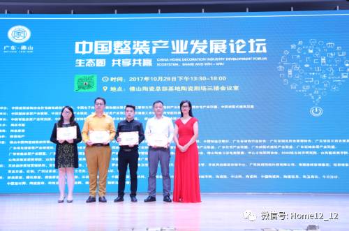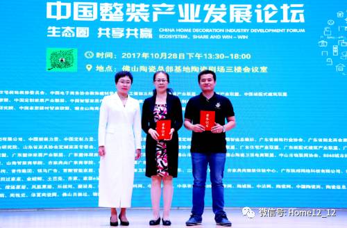 主持人:下面是授牌仪式、PlNGO张总请留步、有请广东省装饰行业协会秘书长郭爽,有请冯帼英老师,给两位授中国整装产业联盟主席团主席成员证书。