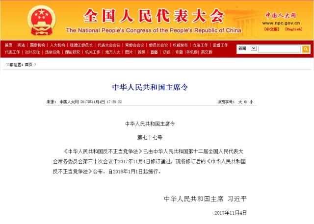 IPRdaily导读:11月4日,第十二届全国人民代表大会常务委员会第三十次会议修订通过了新《中华人民共和国反不正当竞争法》。根据新法规定,经营者违反本法第九条规定侵犯商业秘密的,由监督检查部门责令停止违法行为,处十万元以上五十万元以下的罚款;情节严重的,处五十万元以上三百万元以下的罚款。全文如下。