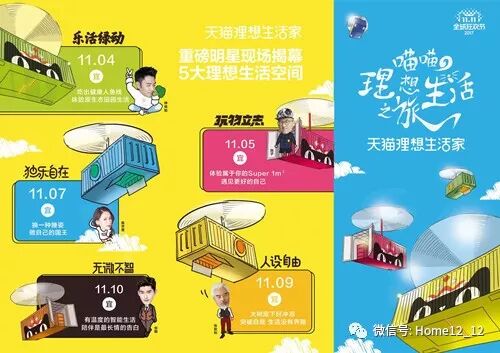 围绕天猫理想生活家,我把快乐带回家的主题,每个集装箱空间都有自己的“人设”。厨房“乐活绿动”,书房“玩物立志”,卧室“独乐自在”,卫生间“人设自由”,客厅“无微不智”。居住空间都有自己的多面人设,每个家主人更有多面个自己,每个人都是一个小我,同时也是一个大我,在个性凸显的当下,凸显自我且爱自己,才是天猫倡导的生活方式及态度。