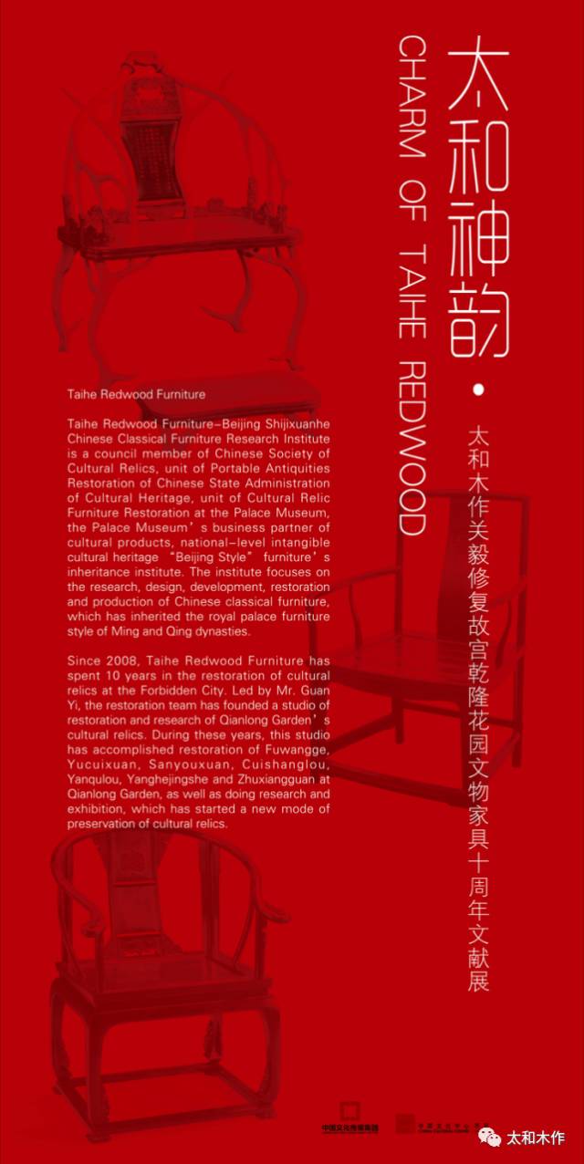 践行文化自信,向海外展示我国优秀传统文化,喜迎党的十九大。10月12日至25日,由中华人民共和国文化部批准并同意,主题为东方亮·中国光影与红木艺术展在澳大利亚悉尼中国文化中心盛大举行。此间,主办方将专门为世界文化遗产修复专家、太和木作创始人关毅先生隆重举办名称为“太和木作关毅修复故宫乾隆花园文物家具十周年文献展”。