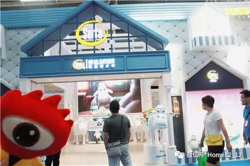 可爱多这次展位布置以空间的和谐为主体,男生的房间有篮球架、小熊,女生的房间是娃娃和梦幻的公主蚊帐。相比于儿童化,可爱多更加走上了时尚风,夏日热带风的绿色装饰是不是走在了审美的前沿了呢?