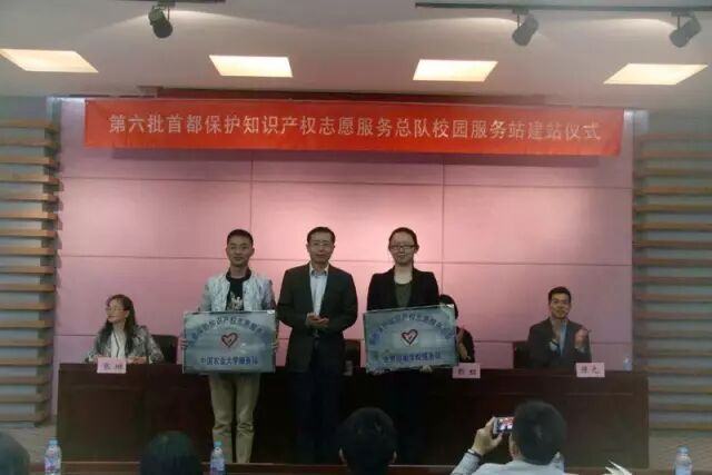 仪式上,北京市知识产权局副巡视员周立权为中国农业大学、北京印刷学院2所新建校园服务站授牌。与会领导为中国人民大学、北京化工大学、首都经济贸易大学、北京中医药大学、北京印刷学院5所高校的首都知识产权保护大学生社会监督员代表授予监督员聘书。北京印刷学院的志愿者代表宣读了《大学生保护知识产权倡议书》。周立权副巡视员在讲话中就进一步做好大学生保护知识产权志愿服务工作提出了建议,他指出要提高认识,明确校园服务站对高校知识产权工作的重要意义;找准切入点,积极探索高校知识产权保护志愿服务新模式;加强管理,建立健全保护知识产权校园服务站的管理制度建设。深化志愿服务经验总结推广,不断提升大学生保护知识产权志愿服务能力和水平。