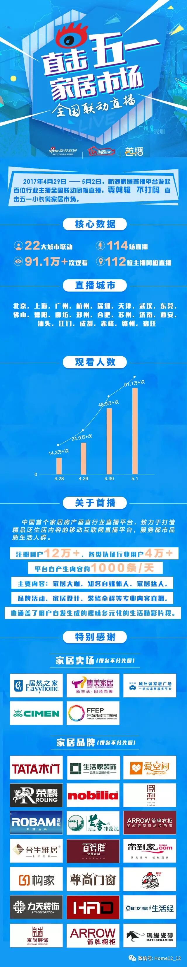 对消费者而言,五一假期既有充足的时间,又会被优惠与折扣吸引。2017年,新浪家居首播平台发起百位行业主播全国联动同框直播,零剪辑、不打码直击五一小长假家居市场。