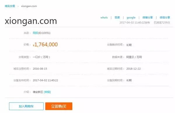 除了商标,域名这把火也烧起来了。“xiongan.com”这一域名,在万网的域名交易平台“米店”上,喊价喊到176.4万元。该域名所有者之前将域名抵押贷款,进行了金融投资。设立雄安新区的新闻一出,域名所有者将域名赎回并在网站进行在线交易。