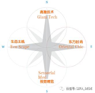 欧洲在北南西东方向的设计特质在当代的最新表现可以分别抽象出高雅技术、视觉博览、生态主线和东方时尚等四个关键词,见图1所示。