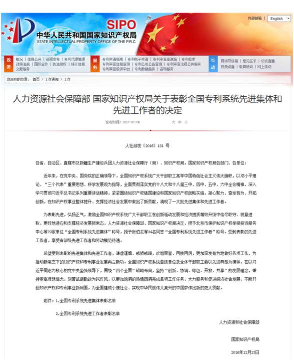 近日,人力资源社会保障部、国家知识产权局对全国专利系统先进集体和先进工作者进行表彰,北京市保护知识产权举报投诉服务中心荣获全国专利系统先进集体。