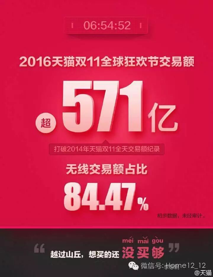截止06:54:52 ,超571亿元,打破2014年天猫双11全天交易额纪录。