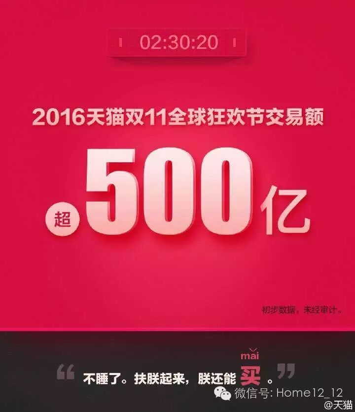2点30分,天猫双十一全球狂欢节交易额超过了500亿,已经达到去年总额的一半。
