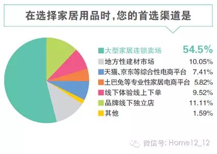这群愿意自主选购家居用品的消费者,在选购时更青睐于何种渠道?调查显示,大型连锁家居卖场将是这个群体的主要去处,54.5%的受访者表示将其列为自己选购家居用品的首选渠道;地方性建材市场、天猫及京东等综合性电商平台、土巴兔等专业家居电商平台、线下体验线上下单、品牌线下独立店等方式都占比在10%上下,平分秋色。