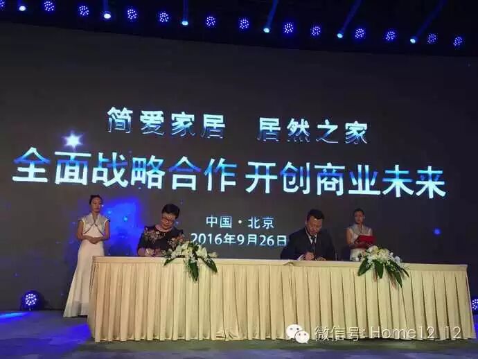 简爱家居董事长罗辑俐(左)、居然之家总裁助理田峻(右),共同签署战略合作备忘书。