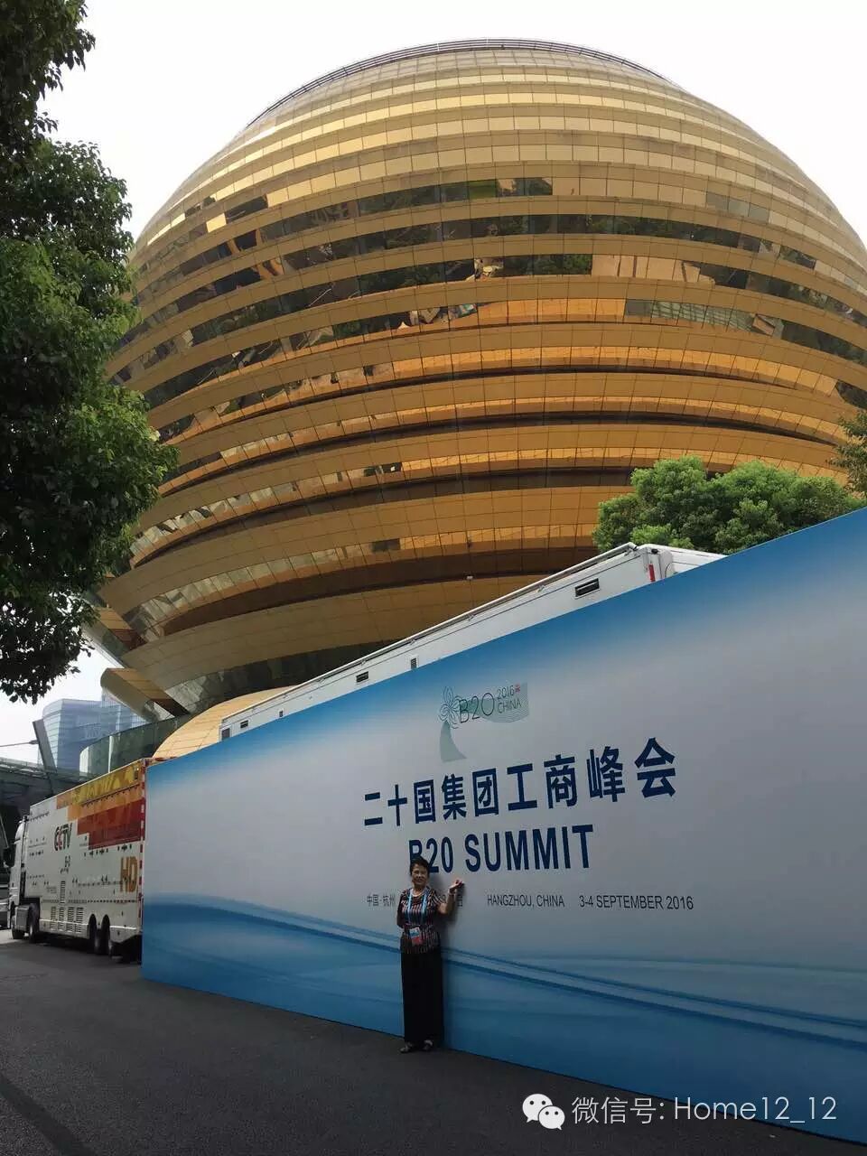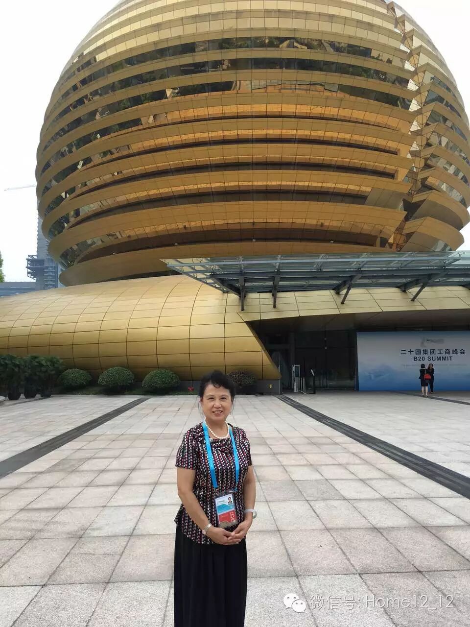集美集团执行总裁刘志萍在杭州国际会议中心前合影留念