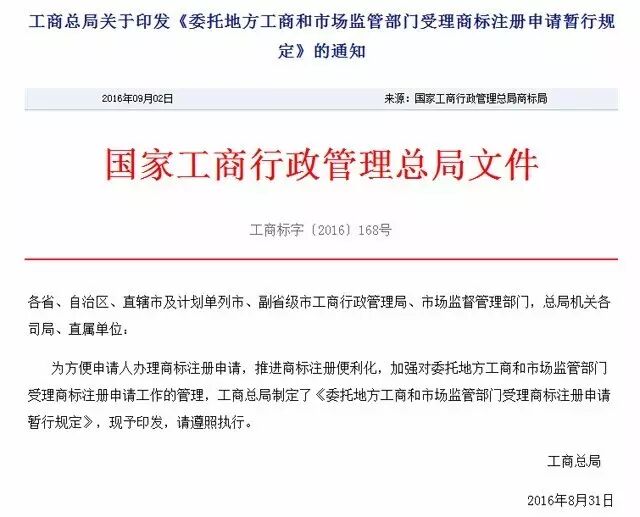 原标题:工商总局关于印发《委托地方工商和市场监管部门受理商标注册申请暂行规定》的通知