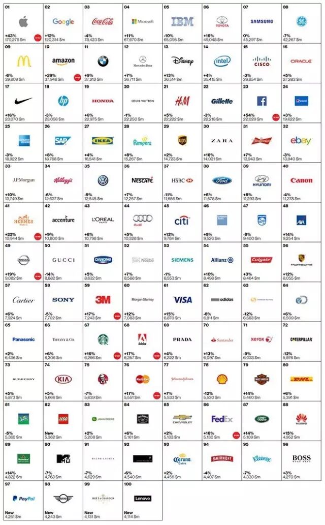 在国际著名品牌评级机构——国际品牌(Interbrand)的2015年的“最佳全球品牌”评选中,华为去年首度上榜,今年品牌价值49.52亿美元,排名跃升至88位。联想品牌价值41.14亿美元,是继华为之后第二个登上Interbrand最佳全球品牌排行榜的中国品牌,排序是第100位。