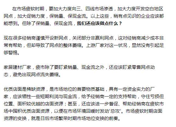 市场危机来临时,具有良好品牌基础的大企业,固然可以依赖强大的品牌号召力,通过加大促销力度,加强对三、四线市场渗透等方式来有效保住销量、保住现金流与市场份额,但却是以牺牲短期利润为代价。