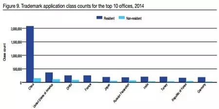 报告称,全球知识产权呈上升发展趋势,2014年中国对全球商标申请量增长的贡献尤为明显,中国国内商标申请量增长了18.2%,占全球商标总量的30%,占了全球商标增幅的五分之四。中国的商标申请量自2000年以来几乎翻了一番。