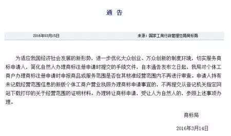2016年3月15日,国家工商行政管理总局商标局发布通告。通告指出,为适应我...