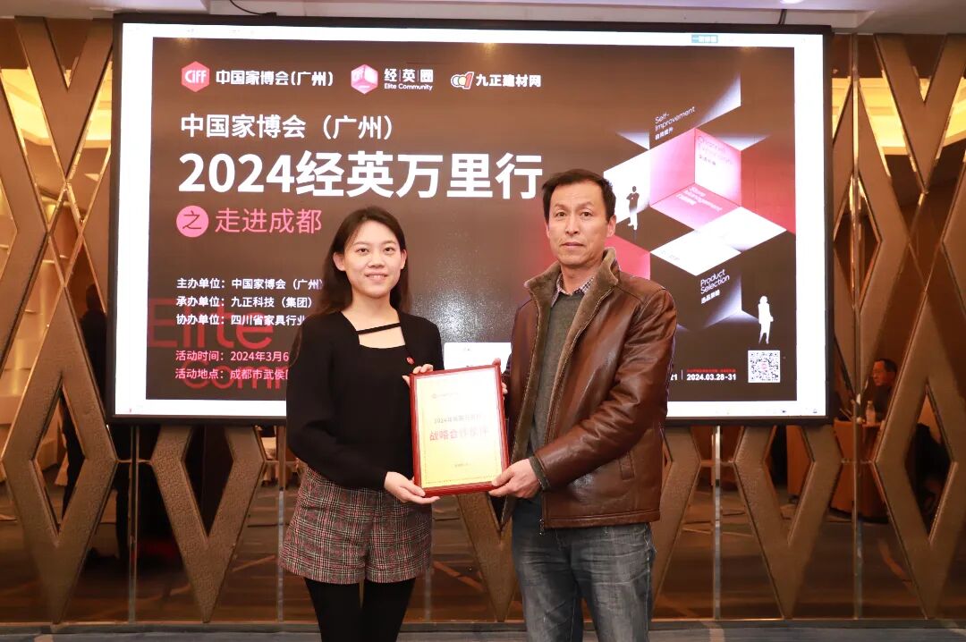 会上,成都八益家具股份有限公司与中国家博会(广州)经英圈达成了战略合作,由成都八益家具股份有限公司市场部副总经理蒲文与中国家博会(广州)经英圈负责人张苏煜代表双方进行了授牌仪式。