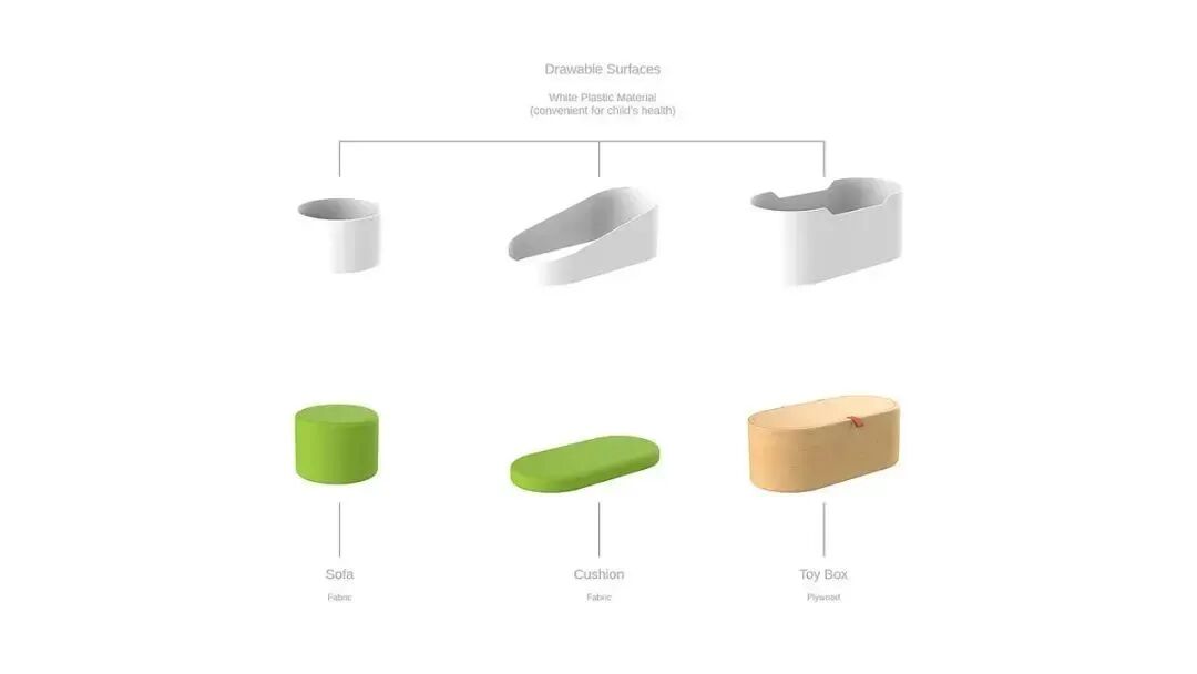 这是能充分满足儿童写写画画需求的家具,能够按照他们自己的意愿设置。小朋友可以随意在上面画自己喜欢的图案,既能够开发丰富的想象力,还能锻炼绘画技能。这类家具是模块化的造型,材质轻盈,小朋友们可以随意组合,打造自己想要的游乐场。