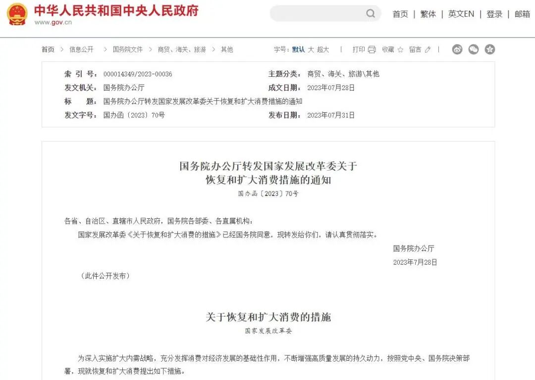 7月31日,国务院办公厅转发国家发展改革委关于恢复和扩大消费措施的通知在中国政府...