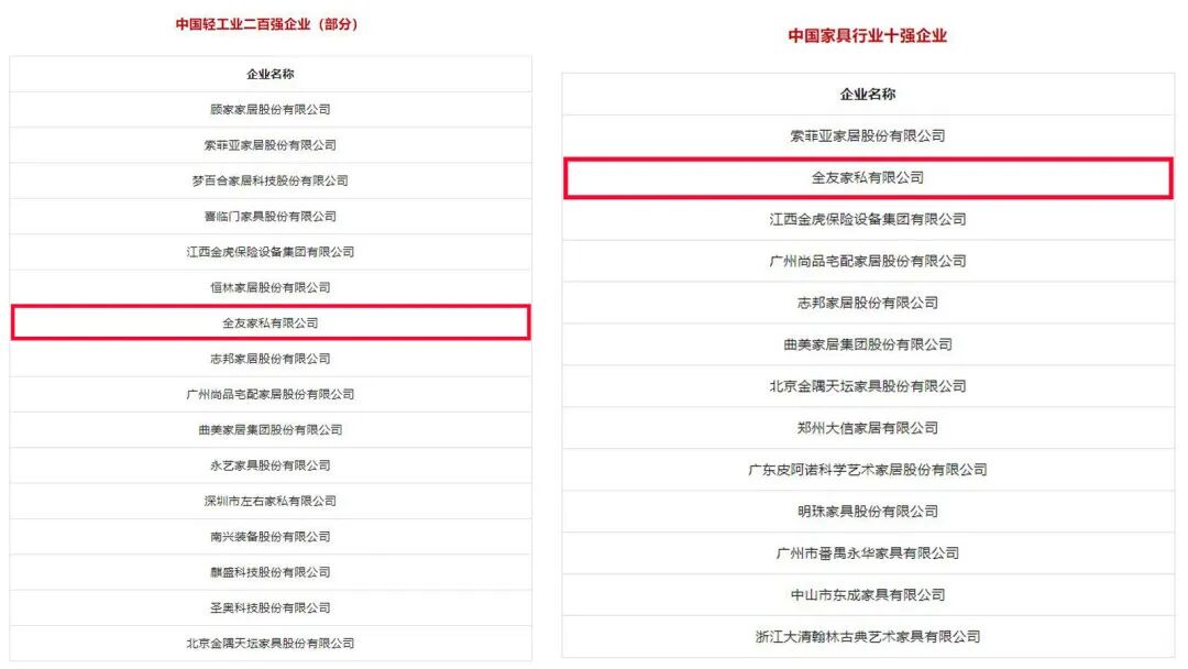 全友家居:登榜2022年度中国轻工业二百强企业、中国家具行业十强企业