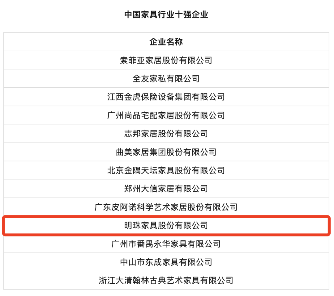 掌上明珠:再次获评中国家具行业十强企业