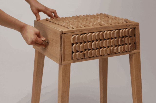 设计师给予抽屉鱼鳞一般的特殊『皮肤』,当抽屉处于关闭状态时,它只是有着花哨外观的普通抽屉,但当抽屉被拉出来的时候,这些『鳞片』也就随之翻动起来并改变颜色,这就让它看起来仿佛某种活物,在外界刺激有了反应。而当抽屉被推回去时,『鳞片』又再次翻动回到原来的状态和颜色,好像它又再次回到了原来的沉睡状态。