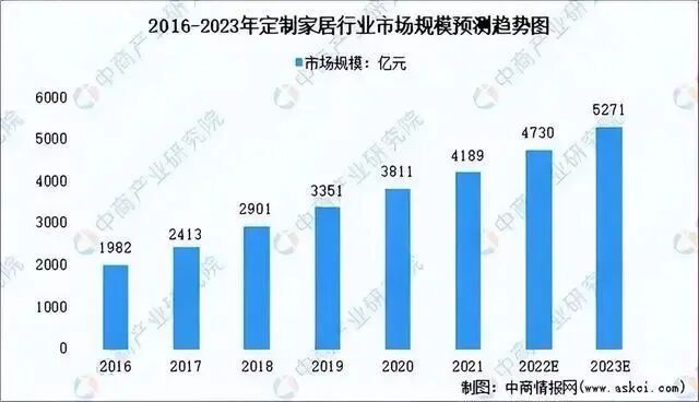 2021年中国定制家居行业的市场规模已经突破4000亿元,2016-2021年复合增长率达16%,行业保持良好的发展态势。中商产业研究院预计2023年中国定制家居市场规模将突破5000亿元。