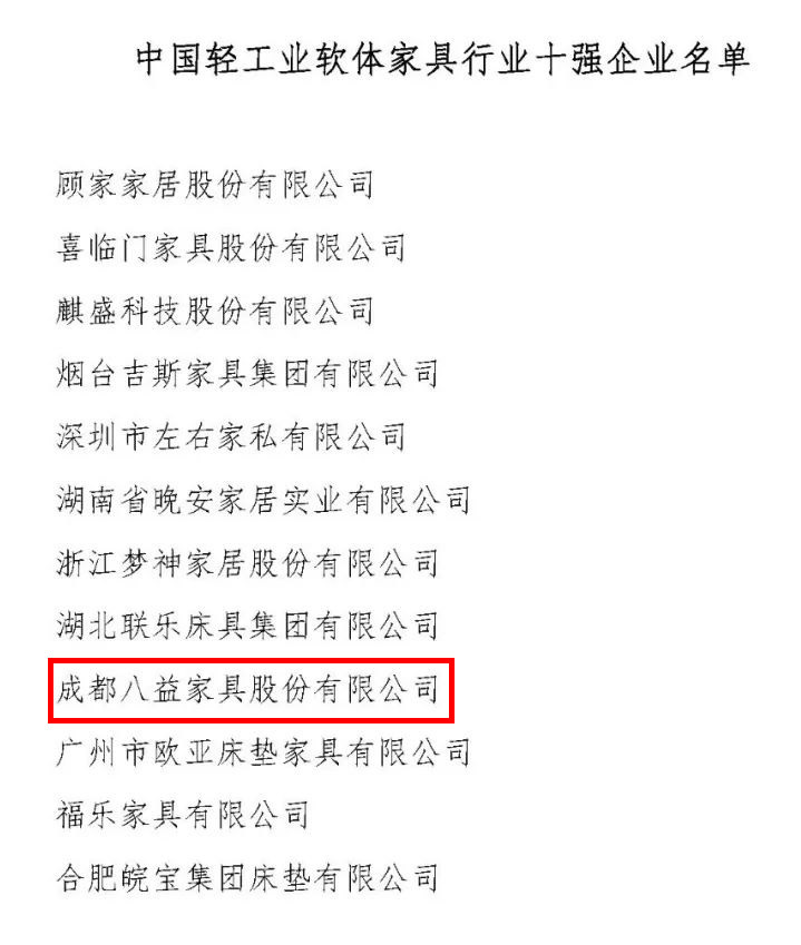 在这诸项荣誉中,四川省家具行业商会会长单位成都八益家具股份有限公司入选“中国轻工业软体家具行业十强企业”,八益旗下品牌“八益床垫”的大豆蛋白纤维床垫获得“中国家具协会2021年度优品”推荐。全友家居荣获“中国轻工业家具行业(综合类)十强企业”、“中国轻工业二百强企业”、“中国家具行业企业信用评价“AAA”级”。明珠家居荣获“中国轻工业家具行业(综合类)十强企业”。这些荣誉的获得既是对川派品牌的高度肯定和认可,更能激发川派家具企业奋发的强大动力,为全国家具行业繁荣发展作出更大的贡献。