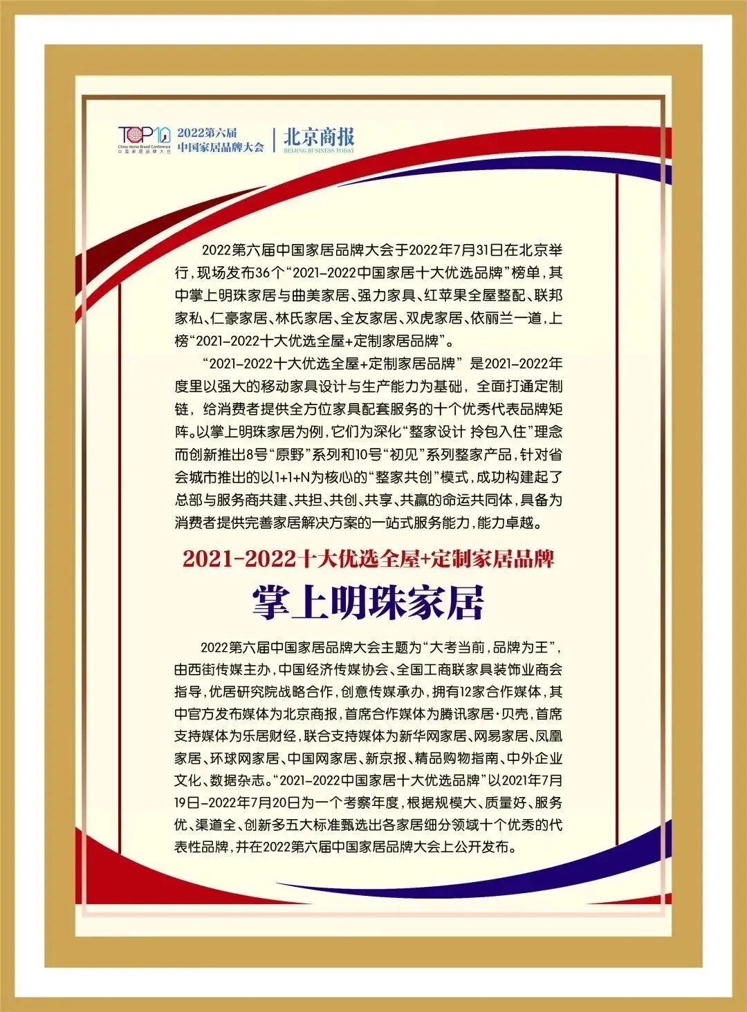 掌上明珠上榜“2021-2022十大优选全屋+定制家居品牌”