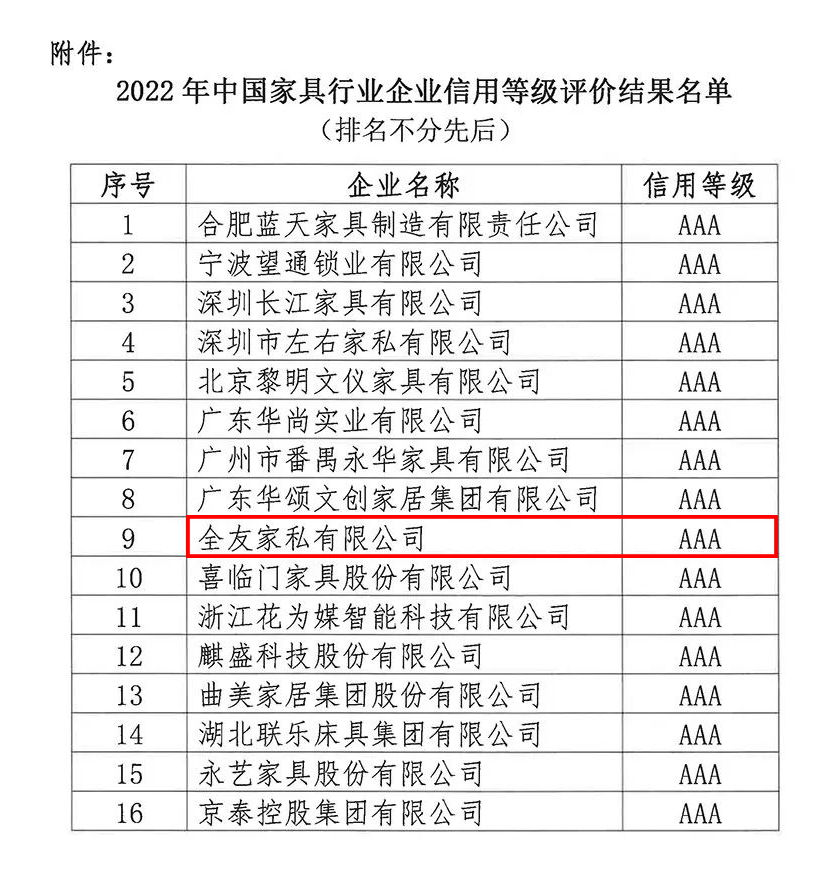 近日,中国家具协会公布了2022年中国家具行业企业信用等级评价结果,共16家家居行业企业上榜,全友家居就是其中之一。