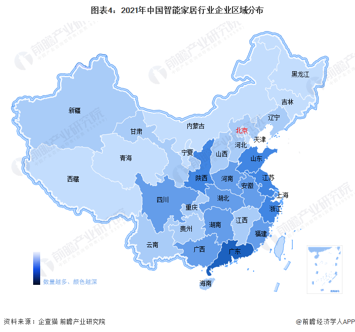 广东省拥有华为、格力、欧瑞博、美的等多家领先企业,可谓中国智能家居行业发展的摇篮。其他领先企业主要分布在北京、广东、浙江和山东,均为东部省市。