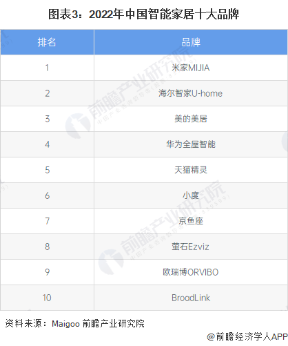 根据Maigoo网发布的2022年中国智能家居十大品牌榜,米家MIJIA、海尔智家U-home、美的美居、华为全屋智能、天猫精灵、小度、京鱼座、萤石Ezviz、欧瑞博ORVIBO、BroadLink依次为排名前十品牌。