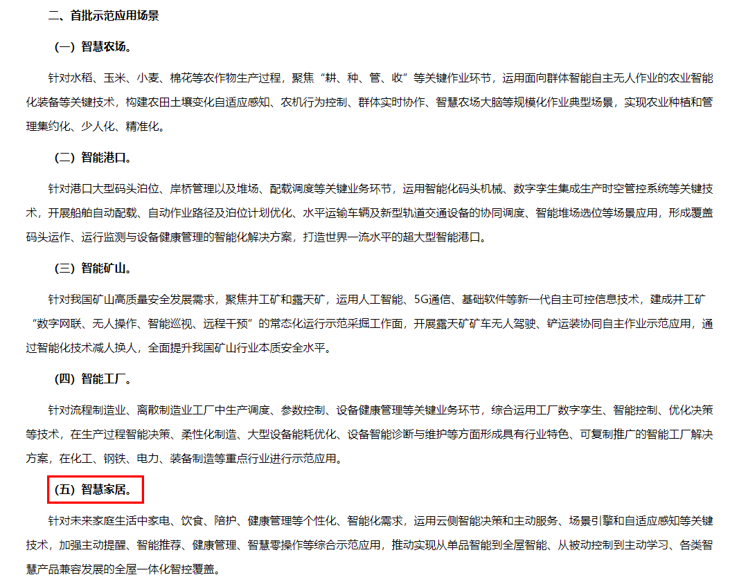 首批支持建设的十个示范应用场景包括智慧农场、智能港口、智能矿山、智能工厂、智慧家居、智能教育、自动驾驶、智能诊疗、智慧法院、智能供应链。