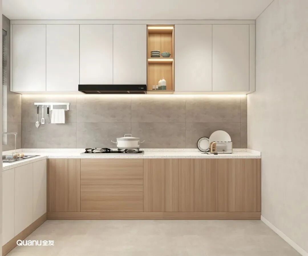 各种各样的餐厨具、调料和大小电器也是一个“庞大家族”,忙碌的烹饪过程往往会让厨房更加杂乱无章,因而需要做到高效收纳,才能保证厨房时刻干净整洁。开放格用来放置使用频率高的调味品,剩下的可以做成封闭式的,地柜则可以用拉篮、转篮等工具将各类餐厨具分区收纳,常用的厨具则可以利用墙面五金进行收纳,让厨房方便整洁。