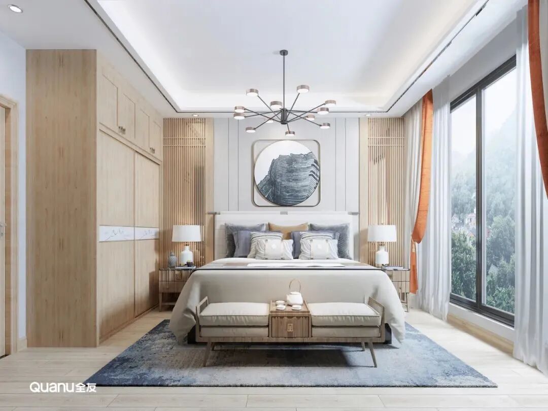 新中式风格卧室的床头背景墙采用对称设计,将两边墙面做成木质栅格板,中间用木饰面或护墙板,再搭配对称的床头柜,整个卧室都具有设计感,并且能营造出一种静谧且沉稳的睡眠氛围。