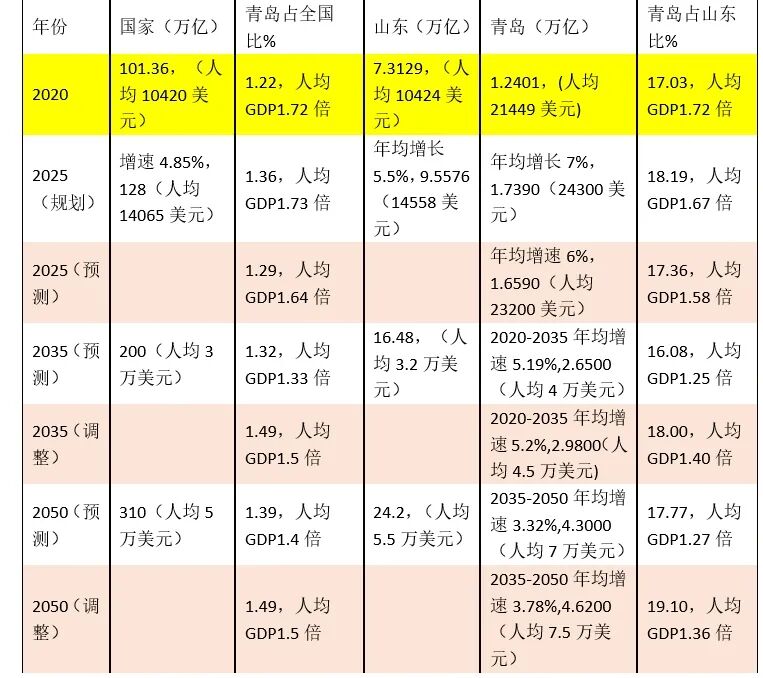 如果全国2035年达到3万美元,作为中国特大城市的青岛理应担负起相应的历史责任,率先走在全国、全省的前列。初步考虑,其经济增长可按照以下两大预期目标来考虑:一是2035和2050均按GDP占全国比重1.49%,人均GDP是全国均值的1.5倍。二是2035年GDP占全省比重18%,人均GDP是全省均值的1.4倍;2050年GDP占全省比重19.10%,人均GDP是全省均值的1.36倍。
