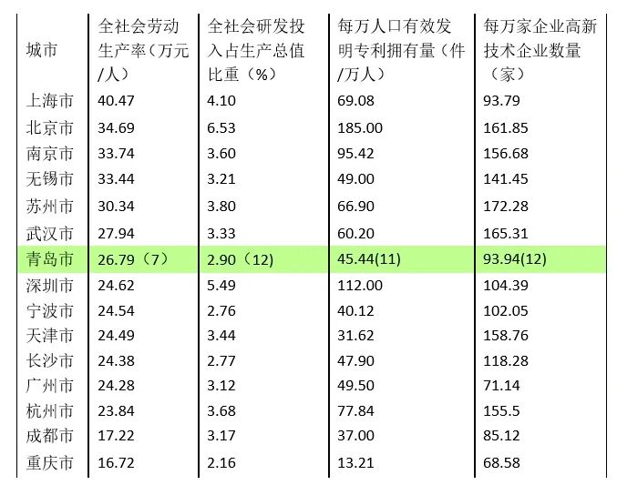 进一步深入看,青岛生产要素利用效率与国内14城市的比较表明,青岛除全社会劳动生产率在15个城市居中游外,其他指标都排在10位以后。而全社会研发投入强度、万人有效发明专利拥有量、万企高技术企业数量这些指标,反映的恰恰是一个城市的科技实力、创新水平与发展后劲。