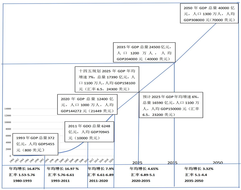 对照上述目标,我们根据1980年代以来青岛经济增长的历史数据和青岛市“十四五”规划的安排,对2035年和2050年青岛经济增长和人均GDP水平做了如下预测(见图1)。