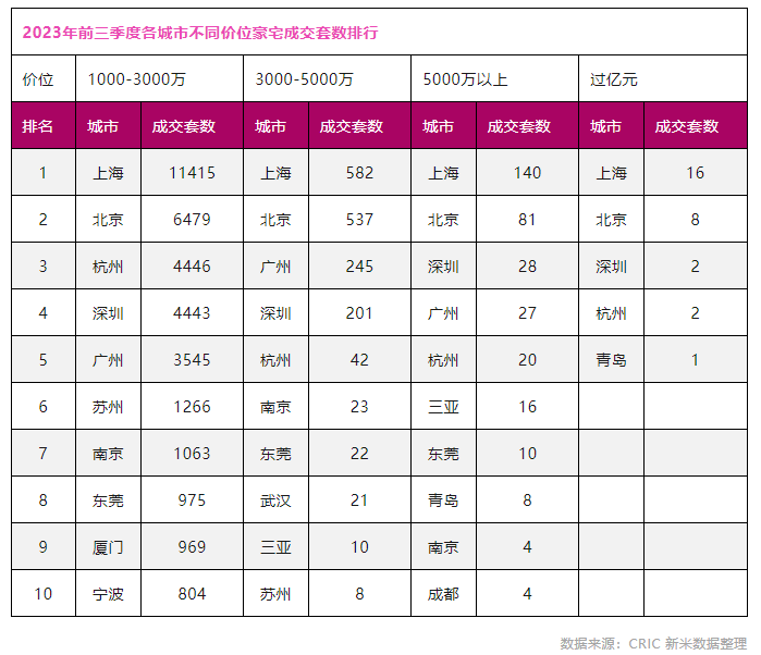 CRIC数据显示,全国重点64城2023年前三季度总价1000万以上豪宅成交4.2万套,同比增加9.03%,过亿豪宅共成交29套,其中有15个城市的成交套数已超2022年全年。
