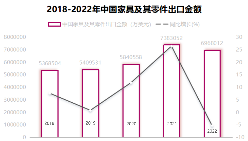 作为中国这个世界家具生产、出口和消费的领军者,我国的国际外交态势以及外部环境的变迁,无疑对全球家居市场带来深远影响。过去五年,全球新冠疫情和经济下行叠加,使得我国家具及其零件出口金额波动上升。