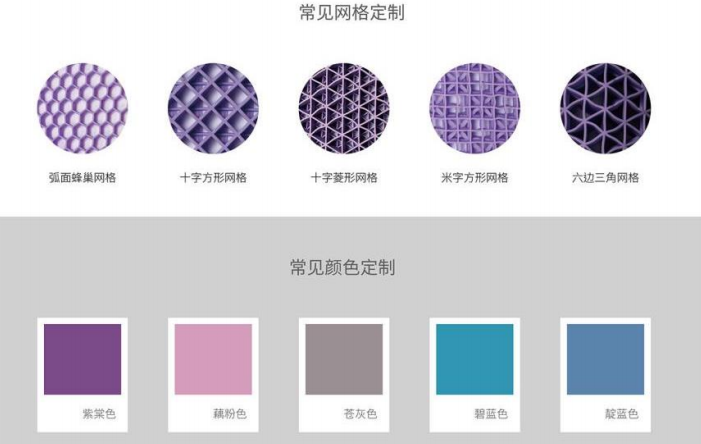 EAC片材按结构分为十字方形网格、十字方形网格、十字菱形网格、米字方形网格、六边形网格和弧面蜂巢网格,如图8所示。其中片材厚度以及网格尺寸、材料颜色均可定制,从而满足不同的使用需求。