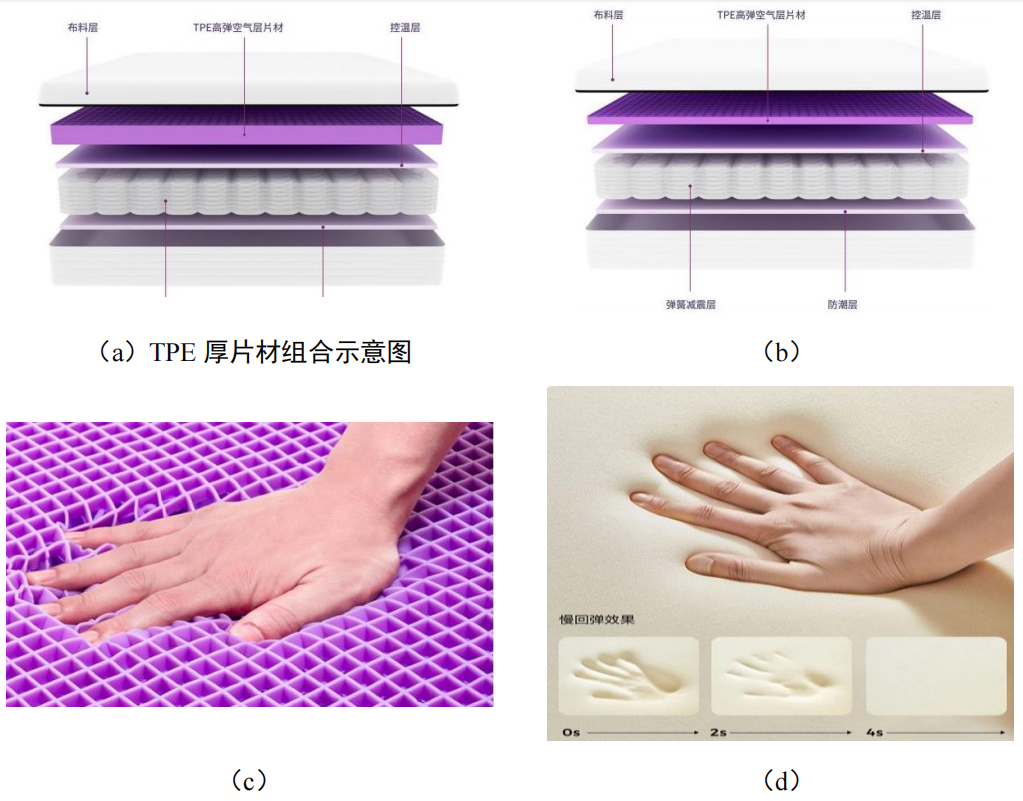 图1 EAC床垫 (a)TPE厚片材组合示意图,(b)TPE薄片材组合示意图,(c)EAC床垫片材变形模拟水流动效果图,(d)记忆海绵变形图