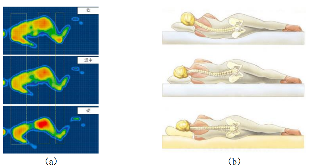图2 床垫硬度对支撑特性影响 (a)人床界面压力分布;(b)卧姿脊柱形态