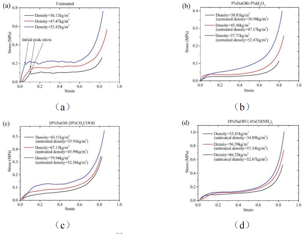 图4 四种柱状丝瓜络应力-应变曲线[2](a)未处理,(b)5%NaOH-5%H2O2处理,(c)10%NaOH-20%CH3COOH 处理,(d)18%NaOH-1.6%CO(NH2)2处理
