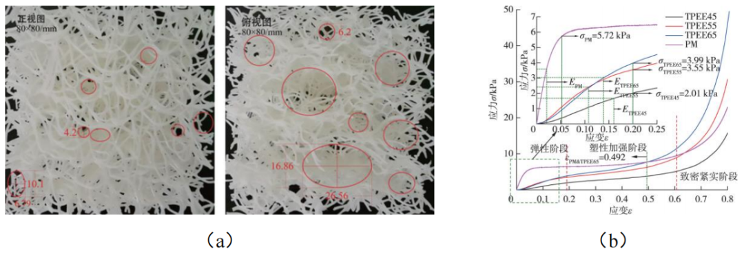 图5 TPEE空气纤维(a)材料表观,(b)应力应变曲线