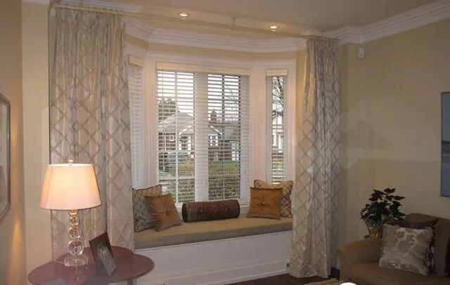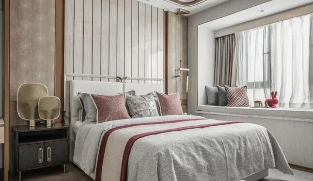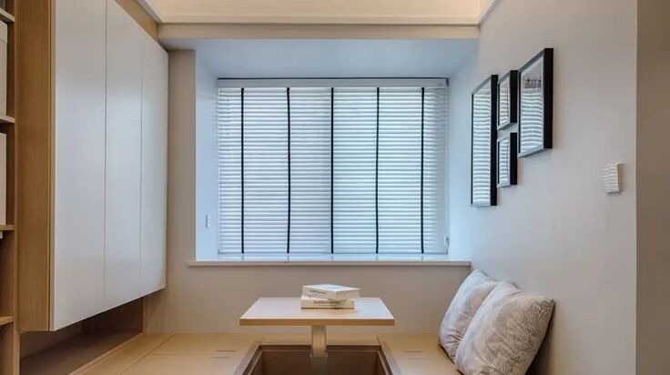 飘窗可以采用百叶帘+布帘组合的方式,百叶帘屏蔽室外刺眼的光线,夏季时坐在飘窗上喝着凉茶翻着书,那感觉简直不要太爽。再配上加厚遮光布帘,则能更好的保证睡眠效果。F