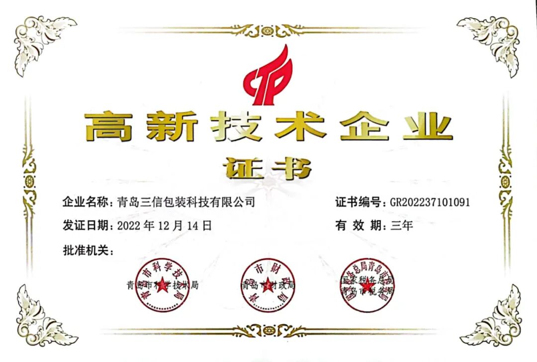 公司先后通过了ISO9001-2000国际标准质量体系、ISO14001-2004国际标准环境管理体系、两化融合管理体系和知识产权管理体系认证。属国家高新技术企业、山东省“专精特新”企业、青岛市专精特新中小企业、青岛市级工业设计中心、青岛市级企业技术中心和青岛市预涂膜自动化包装专家工作站。分别获得山东省两化融合管理体系贯标试点企业、山东省“现代优势产业集群+人工智能”试点示范企业、2018年度山东省两化融合优秀企业奖、青岛市互联网工业自动化生产线证书、青岛市新区互联网工业试点企业和青岛市诚信企业等称号。现拥有授权专利45项,其中发明专利6项,实用新型专利37项,软件著作权2项,受理发明专利6项。公司积极参与包装废弃物的回收再利用工作,参与了1项行业标准,公司主要技术负责人发表科技论文1篇。