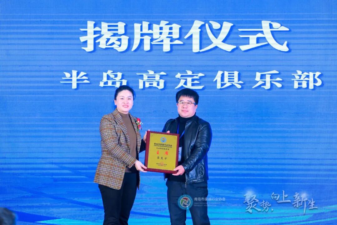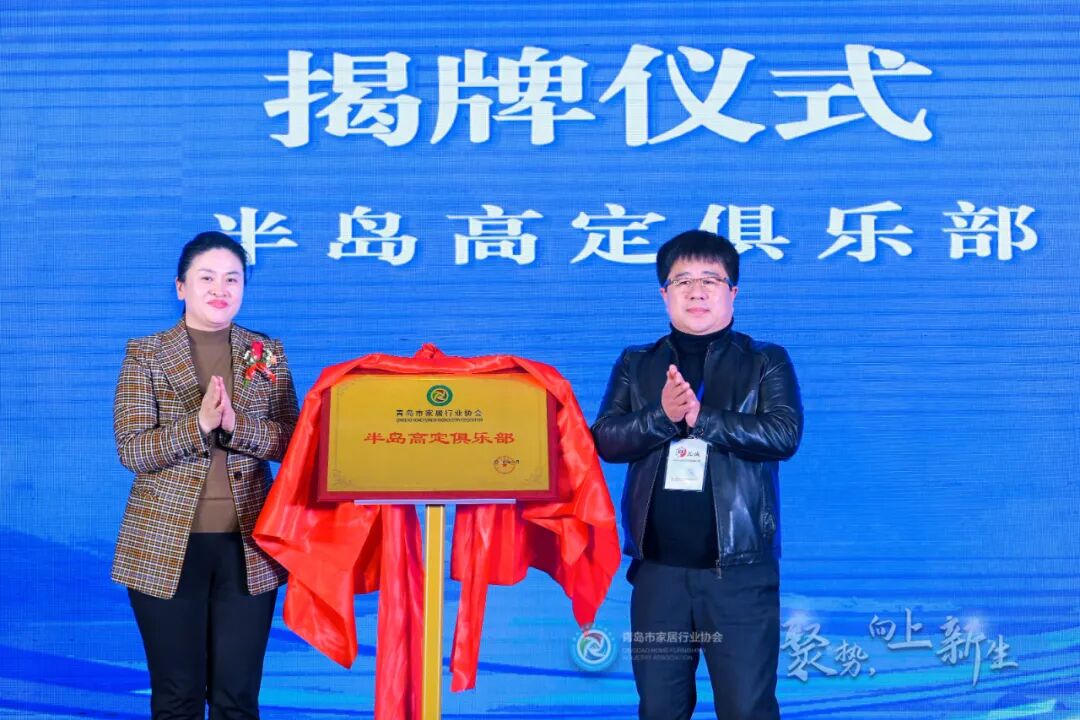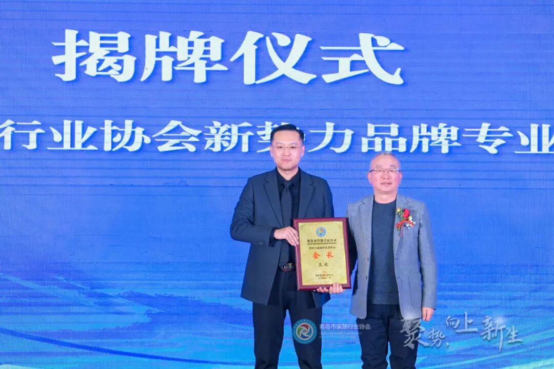 随后,会议进入授牌和揭牌环节。戚振香会长向青岛日顺工贸有限公司董事长吕良才颁发了青岛市家居行业协会半岛高定俱乐部主席牌匾,并共同为青岛市家居行业协会半岛高定俱乐部揭牌。殷兆坤主席为青岛威拜森全屋家居有限公司董事长王政颁发了青岛市家居行业协会新势力品牌专业委员会会长牌匾,并共同为青岛市家居行业协会新势力品牌专业委员会揭牌。
