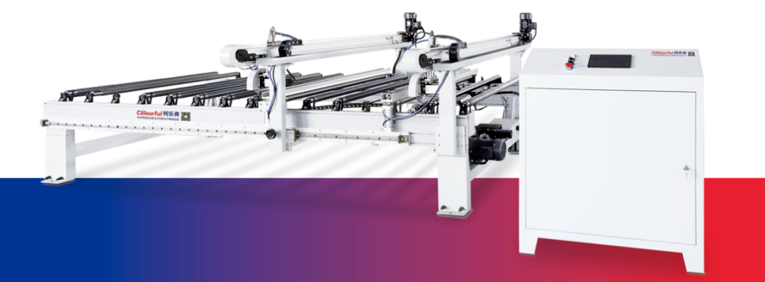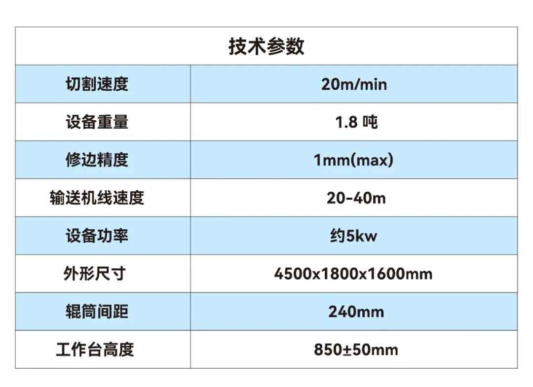 应用于板件包覆断膜后,将长度方向的头尾多余的膜修掉。输送辊筒外包覆耐磨耐溶剂橡胶,防止板件表面划伤,运行更平稳;两把切割刀头,同时工作,一把固定在出料处一端不动,用于齐头;另一把刀头配备同服电机和直线导轨根据板材的长度设定的尺寸进行移动,用于齐尾;可调范围为 500-4000mm;采用高速电机配合圆刀进行齐头尾。